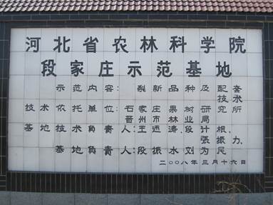 作為河北省農(nóng)林科學(xué)院重點(diǎn)示范基地,院連續(xù)多年設(shè)立科技服務(wù)項(xiàng)目予以經(jīng)費(fèi)支持,石家莊果樹(shù)研究所與晉州市林業(yè)局緊密合作,開(kāi)展示范基地建設(shè)和科技服務(wù)工作。在河北省農(nóng)林科學(xué)院的領(lǐng)導(dǎo)和支持下,通過(guò)所、縣、局、村及廣大果農(nóng)的努力,示范基地生產(chǎn)的梨果內(nèi)外品質(zhì)俱佳,且石細(xì)胞少、果味濃郁、酸甜適口,深受消費(fèi)者歡迎 ,除暢銷(xiāo)廣州、深圳、上海等國(guó)內(nèi)大中城市及港澳外,還遠(yuǎn)銷(xiāo)歐美、東南亞等國(guó)家和地區(qū)。由于該基地成效顯著,段家莊村被評(píng)為“河北省果樹(shù)增收示范村”,示范園通過(guò)了河北省梨無(wú)公害基地認(rèn)證和出口果園注冊(cè),并入選農(nóng)業(yè)部掛牌的標(biāo)準(zhǔn)園。