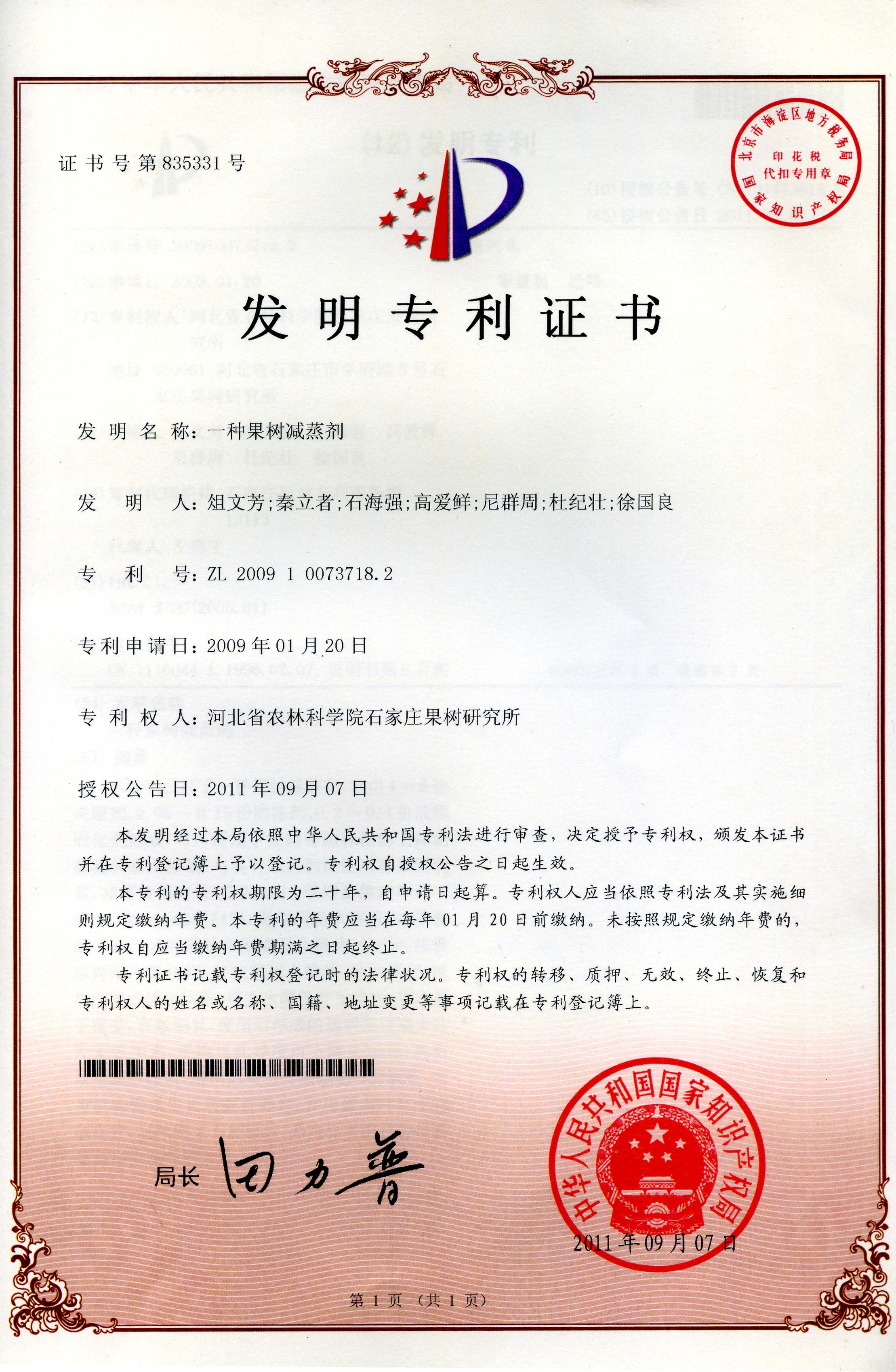 本發(fā)明目的是提供一種不僅適用于果樹同時也適用于其他農林作物的可顯著減少水分散失的減蒸騰劑為達到上述目的,本發(fā)明的技術方案為:將0.05~0.15重量份的尿素溶于4~6重量份的聚乙烯醇液體中形成混合液體,田間使用時再將該混合液體與水按1:100~150的比例稀釋后,再溶入0.2~0.4重量份的氯化鈣,稍加攪拌溶解后即可在果樹樹體上噴施。減蒸劑其特征在于它是由下列重量份的原料制成:成膜劑4~6,防凍劑0.05~0.15,液膜固化劑0.2~0.4。所述成膜劑采用聚乙烯醇,聚乙烯醇具有成膜作用,可在植物葉片上形成一層半透膜,從而有效阻止水分的散失;所述防凍劑采用尿素,其防凍機理為冬季施用時,降低低溫對成膜劑效果的影響,同時還可為植物提供氮素營養(yǎng);所述液膜固化劑采用氯化鈣,他不僅可使聚乙烯醇形成的液膜及時固化成膜,同時具有減蒸作用,并可為植物提供鈣素營養(yǎng)成分。
