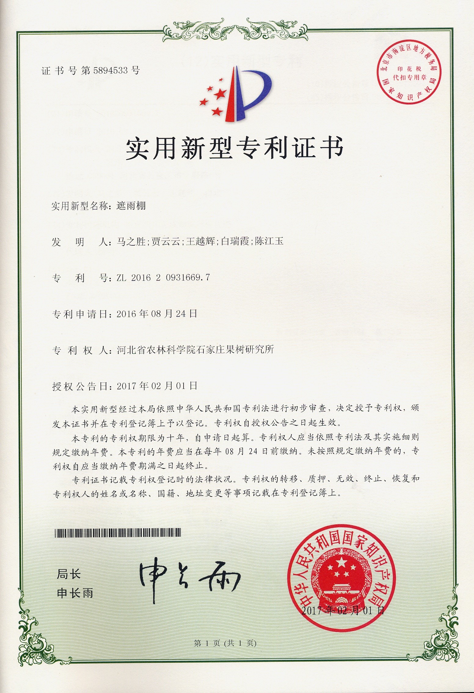 本實(shí)用新型涉及果樹(shù)種植領(lǐng)域,為一種遮雨棚,由立架、高層板和低層板組成。低層板伸入相鄰高層板下方,多個(gè)高層板、低層板間隔設(shè)置,連接固定在立架上,組成遮雨棚。雙層板設(shè)置,在遮雨同時(shí),有利于通風(fēng)散熱,提高了整體抗風(fēng)性能。本實(shí)用新型在保證自身穩(wěn)固、遮雨通風(fēng)前提下,還具有提高果實(shí)產(chǎn)量品質(zhì),延長(zhǎng)果實(shí)采收期的性能。