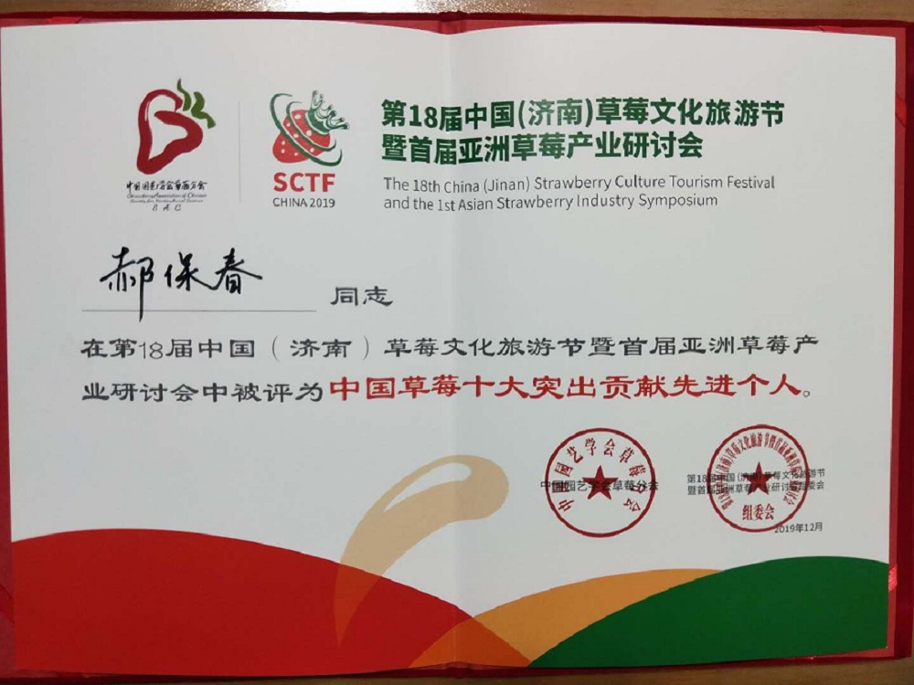 在第18屆中國(guó)(濟(jì)南)草莓文化旅游節(jié)暨首屆亞洲草莓產(chǎn)業(yè)研討會(huì)中,我所退休干部郝保春同志“中國(guó)草莓十大突出貢獻(xiàn)先進(jìn)個(gè)人”。