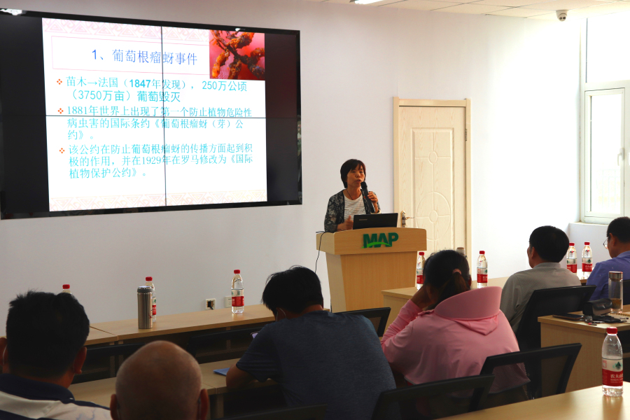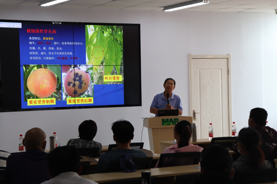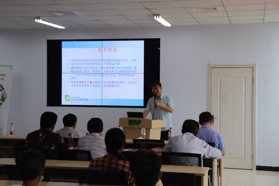 為確?;厥痉兜钠贩N技術(shù)精準(zhǔn)落實(shí)到位,石果所梨、葡萄、桃、干果等相關(guān)專家利用多媒體形式分別進(jìn)行了主題授課,深入講解了桃樹夏季修剪及病蟲害防治技術(shù)、梨園夏季管理、葡萄病蟲害防治等相關(guān)果樹技術(shù)。講座后,專家們就基地技術(shù)人員提出的問題進(jìn)行了現(xiàn)場解答,并發(fā)放了果園技術(shù)明白卡,同時向他們贈送了果樹營養(yǎng)劑。