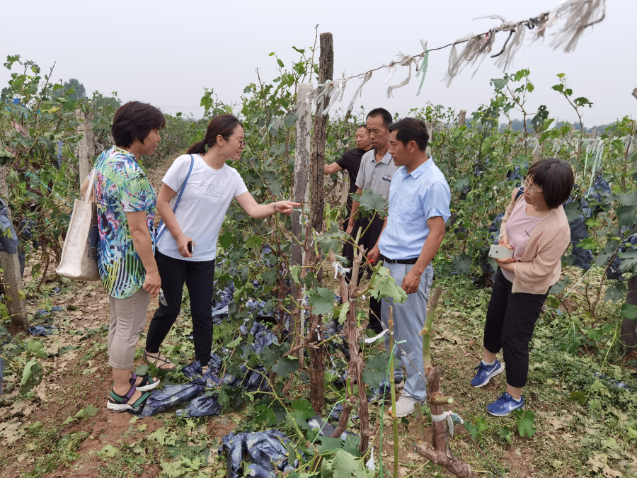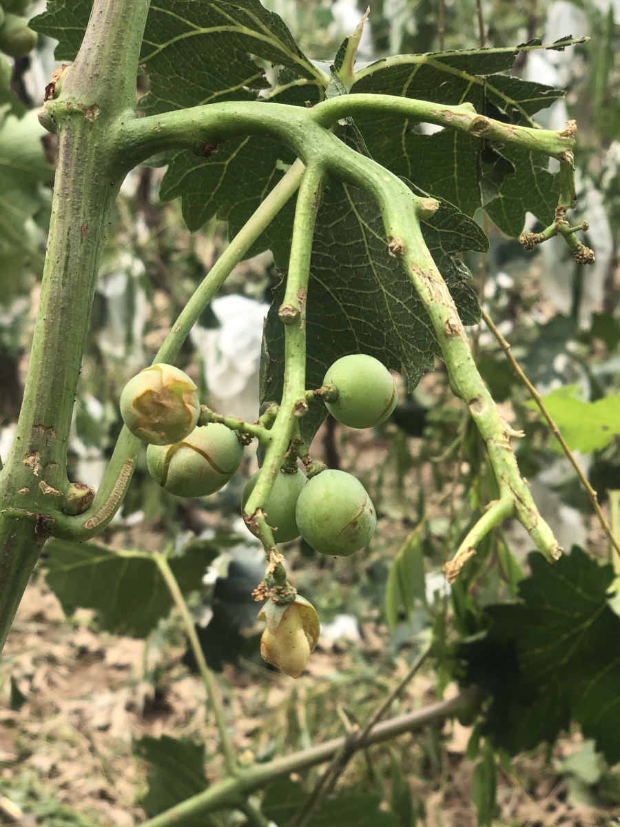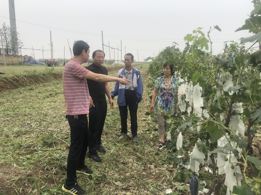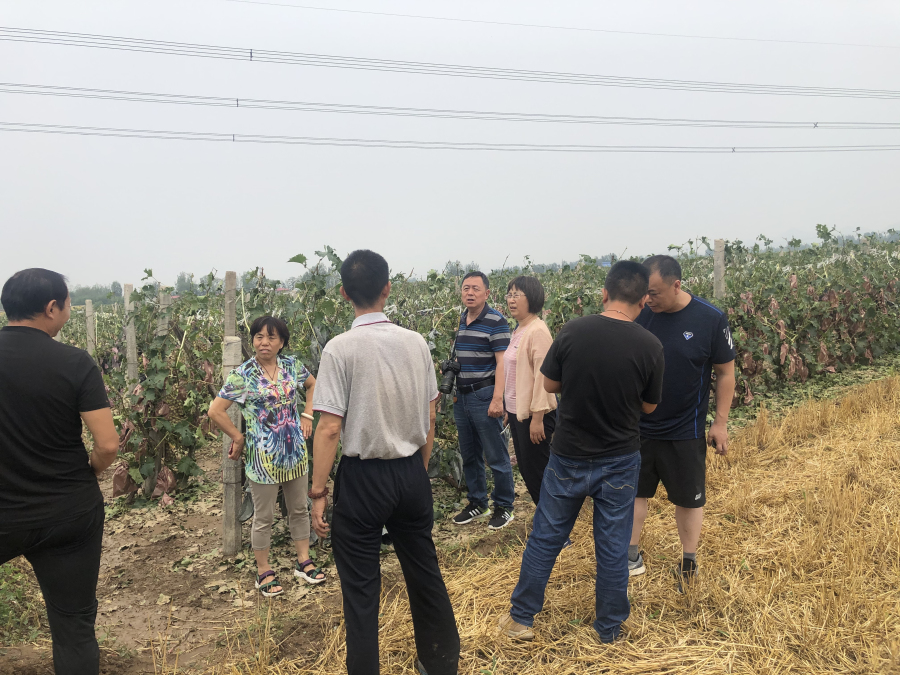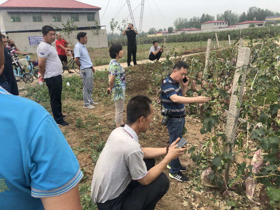 雹災(zāi)發(fā)生后,石家莊果樹研究所褚鳳杰研究員立即通過電話、微信等方式與基地人員聯(lián)系,了解葡萄受害程度。翌日一早褚鳳杰研究員帶領(lǐng)團(tuán)隊(duì)成員赴順平、滿城現(xiàn)場(chǎng)展開調(diào)研,并會(huì)同省水果體系杜國強(qiáng)教授等專家及當(dāng)?shù)剞r(nóng)業(yè)部門商討了救災(zāi)應(yīng)對(duì)方案。