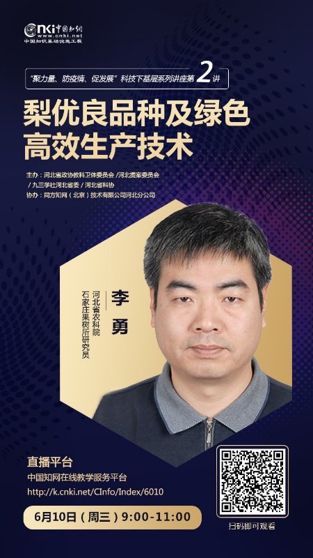 6月10日,我所梨研究室主任李勇研究員在中國知網(wǎng)在線教學(xué)服務(wù)平臺(tái)主講了“凝力量、防疫請(qǐng)、促發(fā)展”科技下基層系列講座第2講。本系列講座是由河北省政協(xié)教科衛(wèi)體委員會(huì)、河北提案委員會(huì)、九三學(xué)社河北省委、河北省科協(xié)主辦。李勇研究員以"梨優(yōu)良品種及綠色高效生產(chǎn)技術(shù)"為題進(jìn)行了講座。