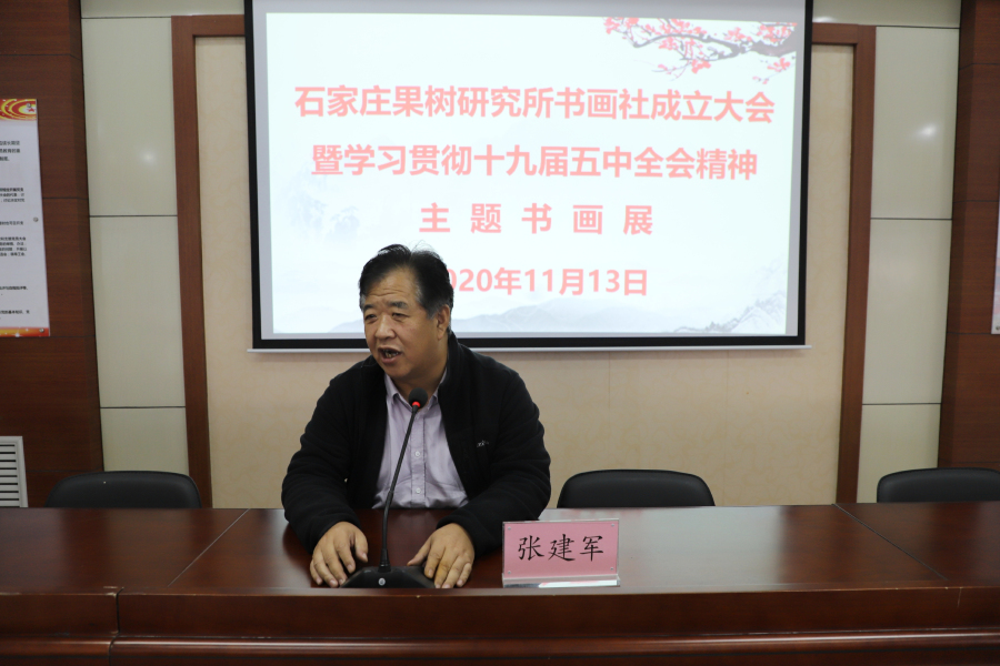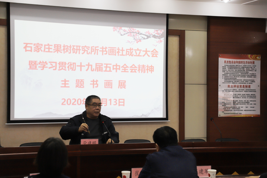 活動(dòng)首先由所長龐昭進(jìn)致辭,對前來參加活動(dòng)的領(lǐng)導(dǎo)、同仁表示熱烈歡迎;他指出,書法、繪畫作為人類文化瑰寶,通過學(xué)習(xí)、練習(xí)書法繪畫可以讓人在浮躁的現(xiàn)代社會(huì)中放松、調(diào)節(jié)心態(tài);同時(shí),成立書畫社也是我所弘揚(yáng)傳統(tǒng)文化、堅(jiān)定文化自信的具體體現(xiàn)。隨后書畫社社長王迎濤作了發(fā)言,希望借助書畫社平臺提升我所職工對傳統(tǒng)文化的認(rèn)知與認(rèn)同感,讓更多的人參與到書畫活動(dòng)中,豐富文化生活,陶冶自身情操,提升綜合素質(zhì)。最后院神農(nóng)書畫社社長、副院長張建軍講話,對貫徹學(xué)習(xí)黨的十九屆五中全會(huì)精神提出了明確要求,對該所開展的文化活動(dòng)給予高度評價(jià),對書畫社的成立表示祝賀,并對書畫社發(fā)展提出指導(dǎo)意見。
