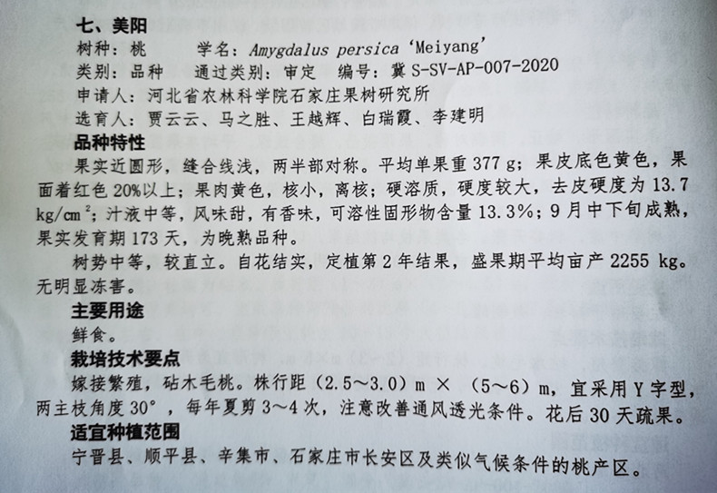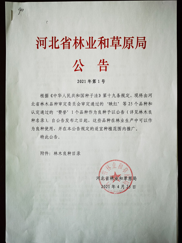 近日,河北省林業(yè)和草原局就2021年審定通過、認(rèn)定通過的26個(gè)新品種發(fā)布公告(河北省林業(yè)和草原局公告 2021年第1號)。我所申請的“冀早紅”杏新樹種,“美陽”“美琳”桃新樹種通過審定。新通過的樹種自公告發(fā)布之日起即可在規(guī)定的適宜范圍內(nèi)作為林業(yè)生產(chǎn)中的良種進(jìn)行推廣使用。