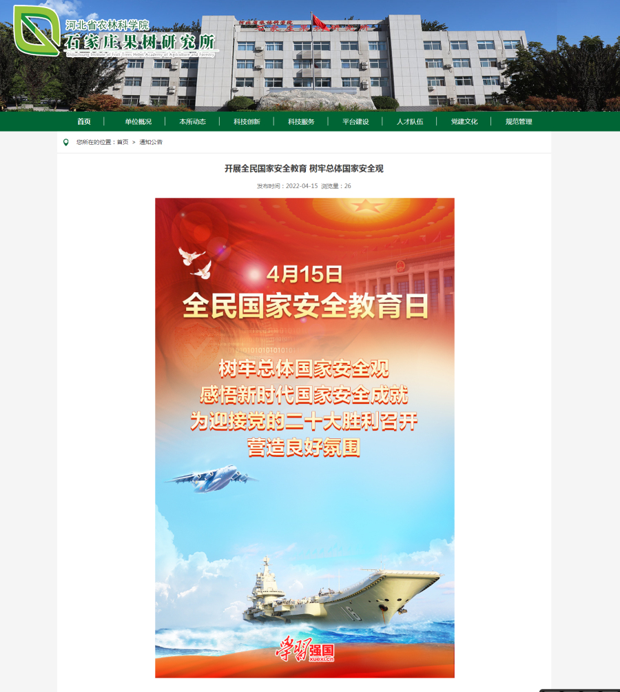 根據(jù)院機(jī)關(guān)黨委通知精神,所黨總支進(jìn)行了活動(dòng)安排部署。各支部黨員積極參與“河北機(jī)關(guān)黨建”開(kāi)展的國(guó)家安全知識(shí)競(jìng)答活動(dòng),通過(guò)答題了解了國(guó)家安全、科技安全的重要意義等國(guó)家安全知識(shí);辦公樓LED屏幕播放國(guó)家安全教育基本常識(shí),研究所網(wǎng)站轉(zhuǎn)載“學(xué)習(xí)強(qiáng)國(guó)”國(guó)家安全教育日主題海報(bào),多渠道進(jìn)行國(guó)家安全教育宣傳,切實(shí)提升全體干部職工的國(guó)家安全意識(shí),動(dòng)員大家共同努力,匯聚起維護(hù)國(guó)家安全的力量,為迎接黨的二十大勝利召開(kāi)營(yíng)造良好氛圍。