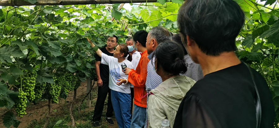 葡萄專家褚鳳杰研究員現(xiàn)場查看了葡萄管理情況,針對葡萄留果量偏多、果粒大小不一、穗形不夠美觀等問題,重點講解了葡萄的果穗整形技術(shù),示范了疏果方法,明確了留果量。同時對膨果處理、肥水管理,枝條副梢修剪及病蟲害防控等管理技術(shù)進行了指導(dǎo)。