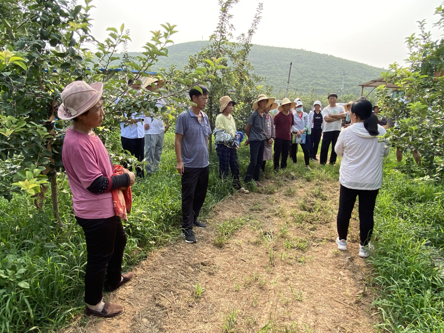 團(tuán)隊負(fù)責(zé)人楊素苗從夏季修剪、拉枝等樹體管理,果實膨大期水肥管理,病蟲害綠色防控等方面進(jìn)行了詳細(xì)的技術(shù)講解,并對果農(nóng)提出的具體問題進(jìn)行了解答與指導(dǎo)。當(dāng)?shù)毓r(nóng)及技術(shù)骨干共40余人參加了此次技術(shù)培訓(xùn)。