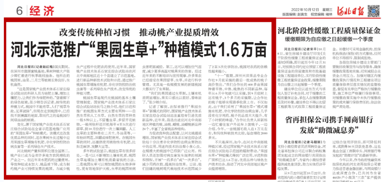 2022年10月12日出版的《河北日報》(經(jīng)濟版面)、2022年10月15日出版的《燕趙農村報》(頭版)分別對我所桃研究室科技人員在衡水深州市開展的科技服務進行了報道。