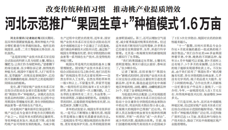 2022年10月12日,《河北日?qǐng)?bào)》第六版以“改變傳統(tǒng)種植習(xí)慣 推動(dòng)桃產(chǎn)業(yè)提質(zhì)增效”為題,對(duì)我所國(guó)家桃產(chǎn)業(yè)技術(shù)體系石家莊桃綜合試驗(yàn)站“果園生草+”種植模式在桃園中應(yīng)用效果進(jìn)行了報(bào)道。