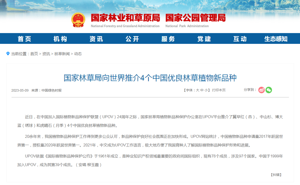 近日,在中國(guó)加入國(guó)際植物新品種保護(hù)聯(lián)盟(UPOV)24周年之際,國(guó)家林草局植物新品種保護(hù)辦公室在UPOV平臺(tái)推介了冀早紅(杏)、中山杉、博大藍(lán)(繡球)和虎睛石(月季)4個(gè)中國(guó)優(yōu)良林草植物新品種。