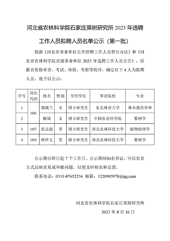 河北省農(nóng)林科學(xué)院石家莊果樹研究所2023年選聘工作人員擬聘人員名單公示(第一批)