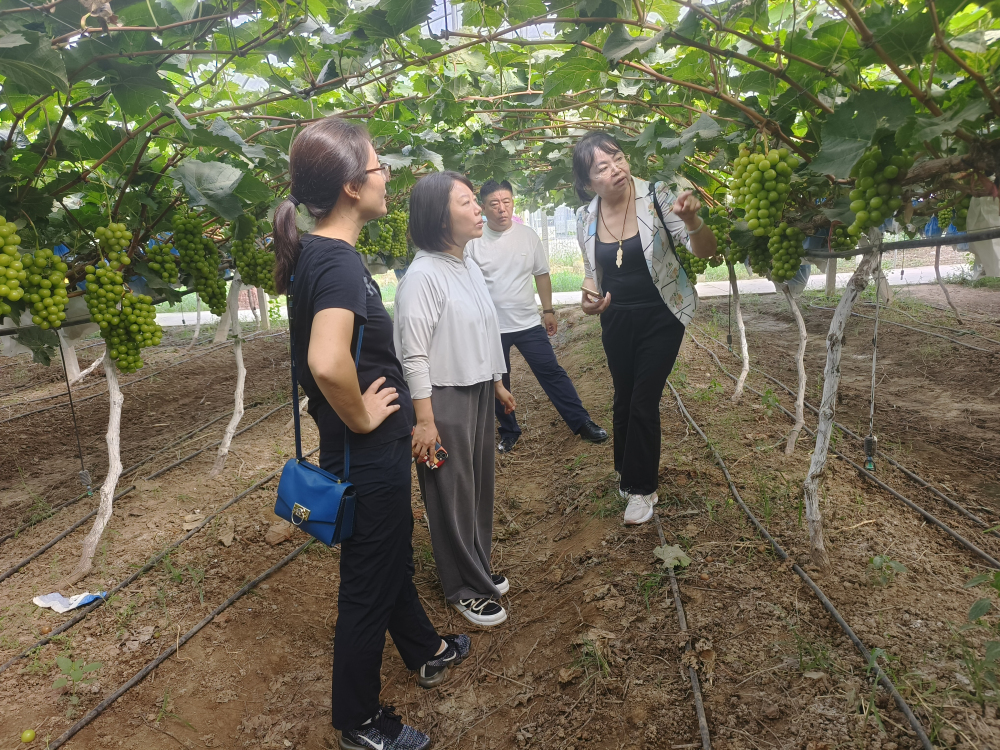 在葡萄研究室主任、石家莊葡萄綜合試驗(yàn)站站長(zhǎng)楊麗麗及團(tuán)隊(duì)成員的陪同下,吳江老師和魏靈珠老師參觀了我所葡萄示范園,雙方在葡萄栽培、品種選育、體系合作等方面進(jìn)行了交流,并就‘天工墨玉’在河北的推廣達(dá)成合作意向。隨后,兩位老師參觀了我所位于正定東房頭村的陽(yáng)光玫瑰葡萄種植基地,就‘陽(yáng)光玫瑰’在河北的產(chǎn)銷(xiāo)情況進(jìn)行了交流。