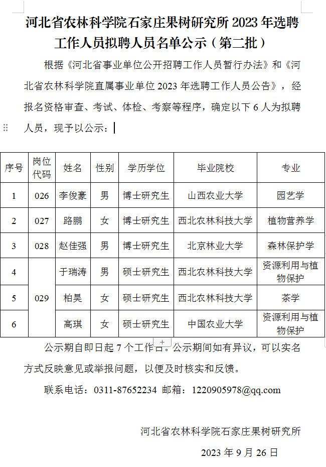 河北省農(nóng)林科學(xué)院石家莊果樹研究所2023年選聘工作人員擬聘人員名單公示(第二批)