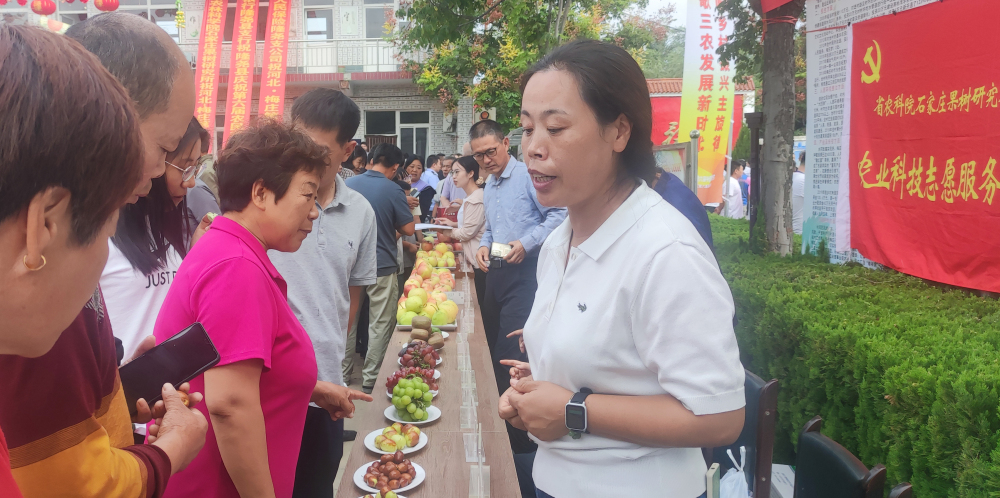 參加活動(dòng)人員現(xiàn)場(chǎng)參觀了梅莊村“國(guó)紅”蘋果綠色種植示范基地,深入交流學(xué)習(xí)種植技術(shù)、產(chǎn)業(yè)發(fā)展思路,對(duì)示范基地因地制宜,特色打造頻頻稱贊。我所專設(shè)展臺(tái),展列以蘋果元素為主的自研新品種、新優(yōu)系共29個(gè),設(shè)立宣傳展牌7塊,發(fā)放果樹生產(chǎn)相關(guān)書籍80本、技術(shù)手冊(cè)100冊(cè)。隆堯縣四套班子主要領(lǐng)導(dǎo)專程參觀了我所展臺(tái)并對(duì)研究所自研新品種、新優(yōu)系進(jìn)行品鑒,詢問了科技專家不同品種生長(zhǎng)特性及配套栽培技術(shù)要點(diǎn),對(duì)研究所的科技成果展示給予了高度評(píng)價(jià),其中我所自主選育蘋果新品種“晉州紅”深受好評(píng)。當(dāng)?shù)厝罕?、果農(nóng)紛紛參觀了我所展臺(tái)并現(xiàn)場(chǎng)進(jìn)行了咨詢,各研究室專家現(xiàn)場(chǎng)對(duì)果農(nóng)提出的問題提供了技術(shù)指導(dǎo)并對(duì)相關(guān)專業(yè)知識(shí)進(jìn)行了科普。