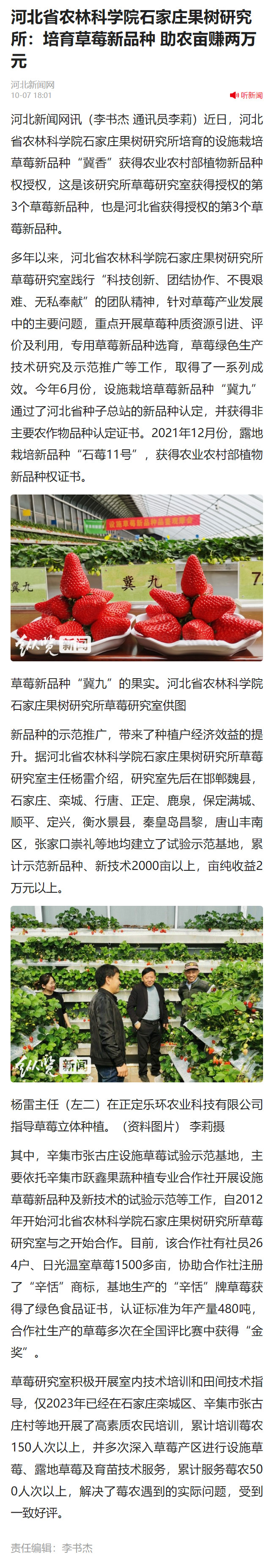 草莓研究作為我所發(fā)展較快的優(yōu)勢學(xué)科,著力做好科技創(chuàng)新、科技服務(wù)等方面工作,熱誠服務(wù)于廣大草莓生產(chǎn)者。近日,河北日報網(wǎng)(縱覽新聞)對草莓研究團(tuán)隊進(jìn)行了宣傳報道。