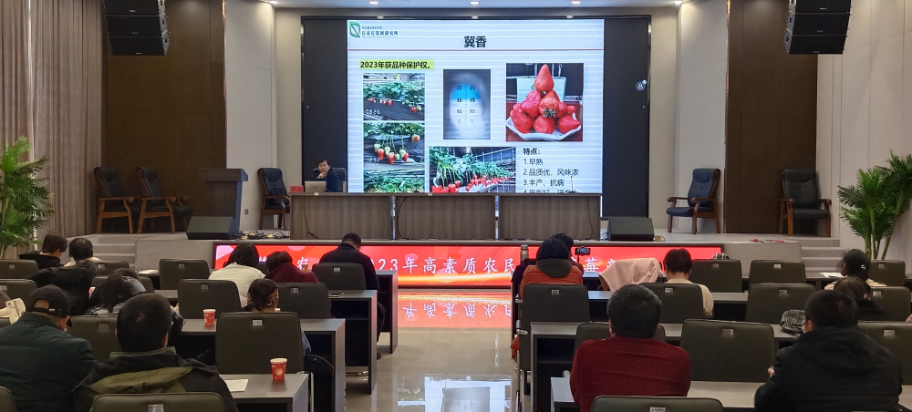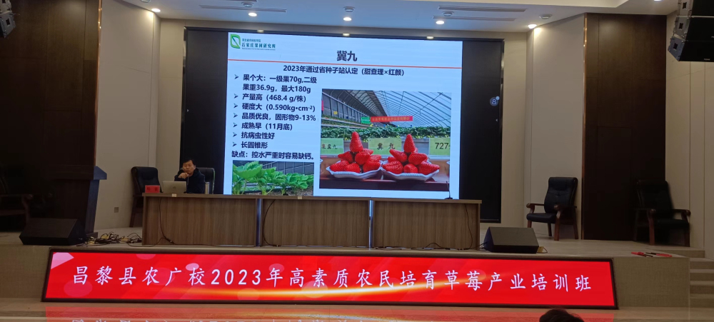 楊雷研究員以《優(yōu)良草莓品種及生產(chǎn)中常見問題》為題進行了技術(shù)培訓,內(nèi)容主要包括草莓的營養(yǎng)保健價值、河北省草莓生產(chǎn)現(xiàn)狀、優(yōu)良草莓新品種及生產(chǎn)中常見的主要問題等方面進行了講解,重點講解了自育草莓新品種‘冀九’的果實特性、早熟性、豐產(chǎn)性、耐貯性及抗病蟲性等,該品種2023年6月通過河北省種子總站的認定,并獲得認定證書,11月份入選全國1000項優(yōu)秀農(nóng)業(yè)科技成果。該品種在昌黎縣劉李莊村表現(xiàn)優(yōu)秀,得到了昌黎英俠果蔬種植專業(yè)合作社及種植者的認可,雙方在‘冀九’品種權(quán)使用上初步達成了協(xié)議,協(xié)議的達成必將促進我院農(nóng)業(yè)科技成果轉(zhuǎn)化和推廣應用,擴大我院品種及技術(shù)影響。