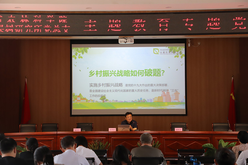 龐昭進專題黨課題目為《鄉(xiāng)村振興如何破題?》。分別從鄉(xiāng)村振興戰(zhàn)略提出的背景、鄉(xiāng)村振興的戰(zhàn)略意義、實施鄉(xiāng)村振興要把握的關(guān)鍵問題、我國糧食(食品)安全需求及現(xiàn)狀、對當(dāng)前農(nóng)村改革發(fā)展給予精準(zhǔn)規(guī)劃設(shè)計和如何解決好農(nóng)業(yè)農(nóng)村面臨的兩大突出問題等方面為大家進行講解。