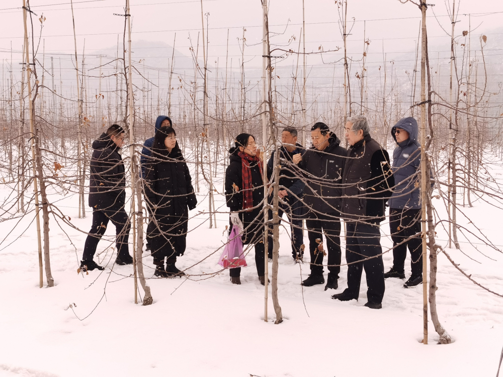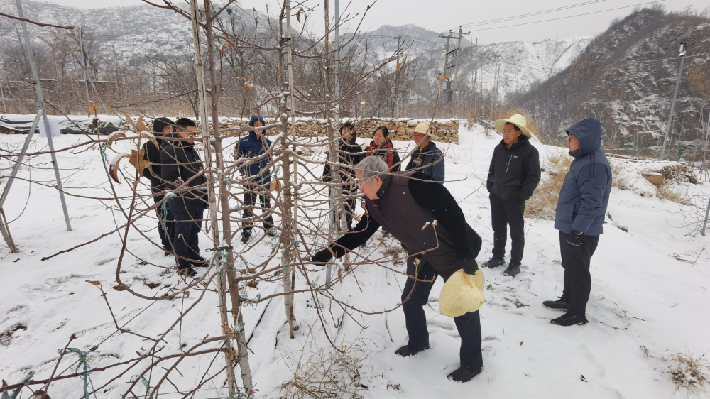 2月29日,蘋果栽培團(tuán)隊(duì)專家冒著漫天飛雪深入園區(qū),查看園區(qū)和樹體生長情況。針對2023年冬季持續(xù)降雪、低溫天氣,在前期對園區(qū)應(yīng)急技術(shù)指導(dǎo)基礎(chǔ)上,調(diào)研果園幼樹越冬情況,全面考察了園區(qū)各品種樹體生長情況,制定不同年齡階段樹體整形目標(biāo),現(xiàn)場示范了春季輕簡化整形修剪技術(shù)。