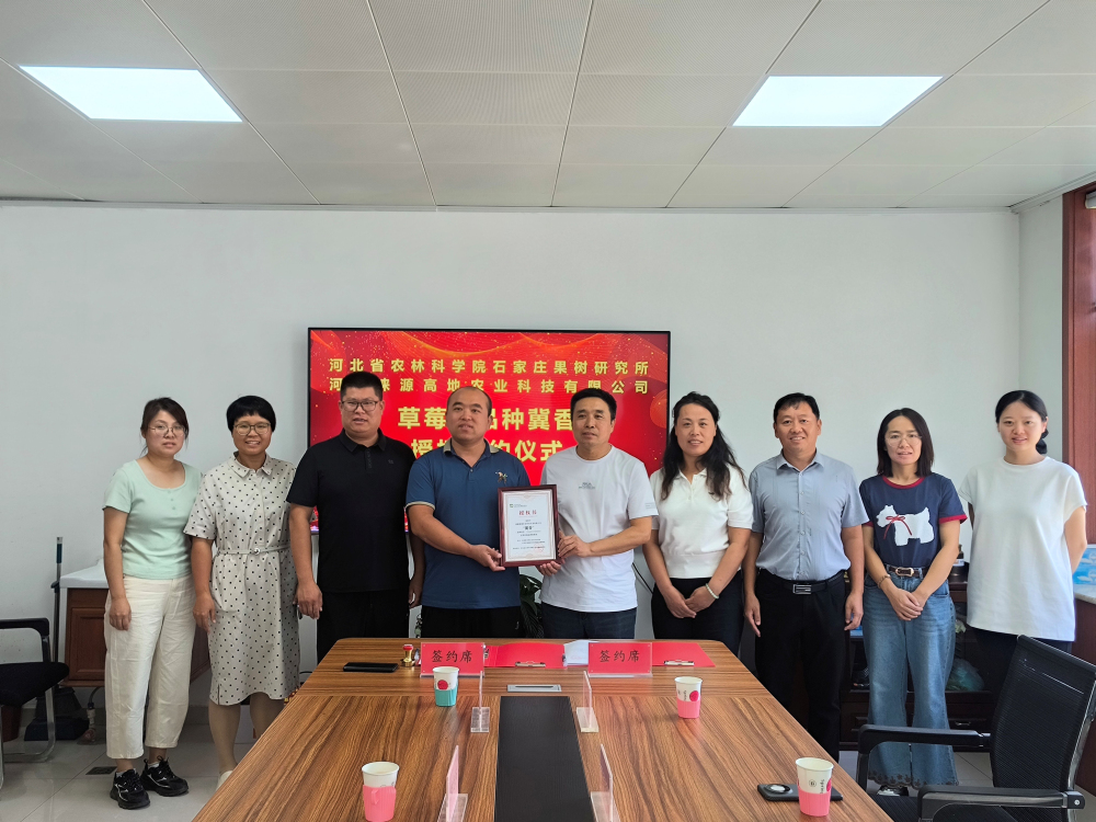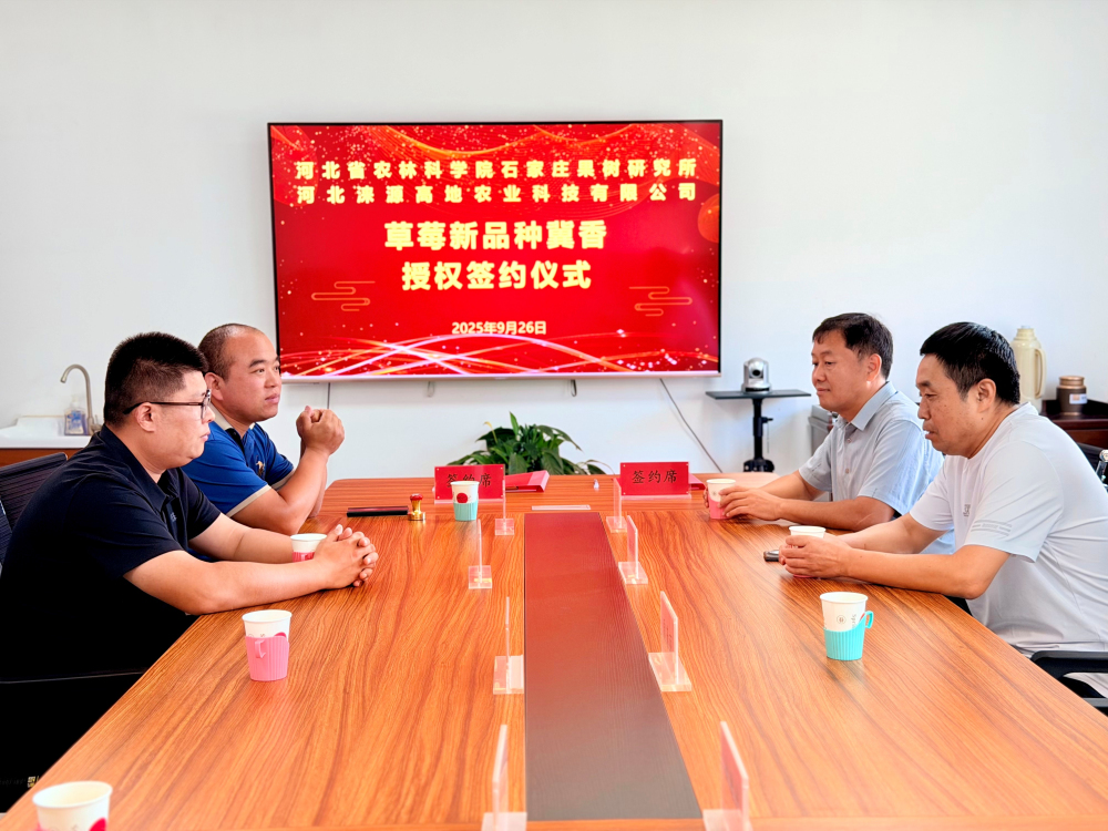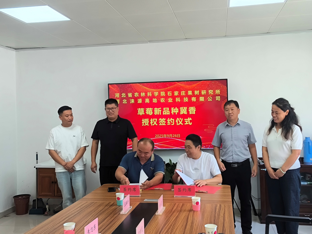 2025年9月26日河北省農(nóng)林科學(xué)院石家莊果樹研究所選育的優(yōu)良夏草莓新品種‘冀香’在石家莊果樹研究所再次成功授權(quán)簽約,授權(quán)方為保定市淶源高地農(nóng)業(yè)科技開發(fā)有限公司。河北省農(nóng)林科學(xué)院石家莊果樹研究所所長鄢新民、草莓研究室團(tuán)隊成員及科技管理相關(guān)人員、淶源高地農(nóng)業(yè)科技開發(fā)有限公司負(fù)責(zé)人王海濤及相關(guān)人員參加了授權(quán)簽約儀式。